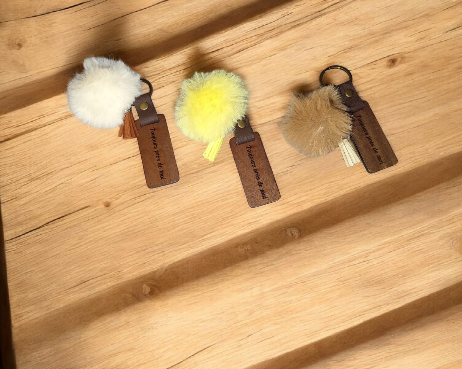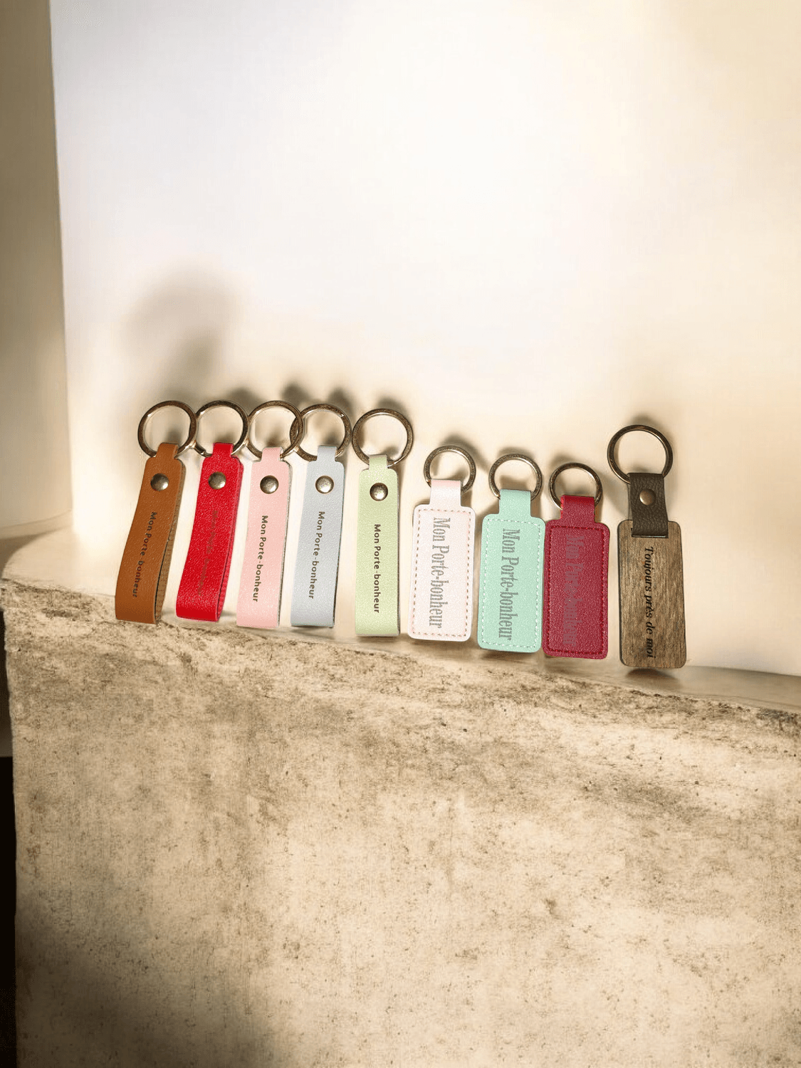 La gamme se décline en similicuir, cuir véritable et bois avec un message gravé, agrémentée de pierres naturelles ou accessoires (cœurs, pompons...)pour s’adapter à toutes les personnalités et toutes les intentions.