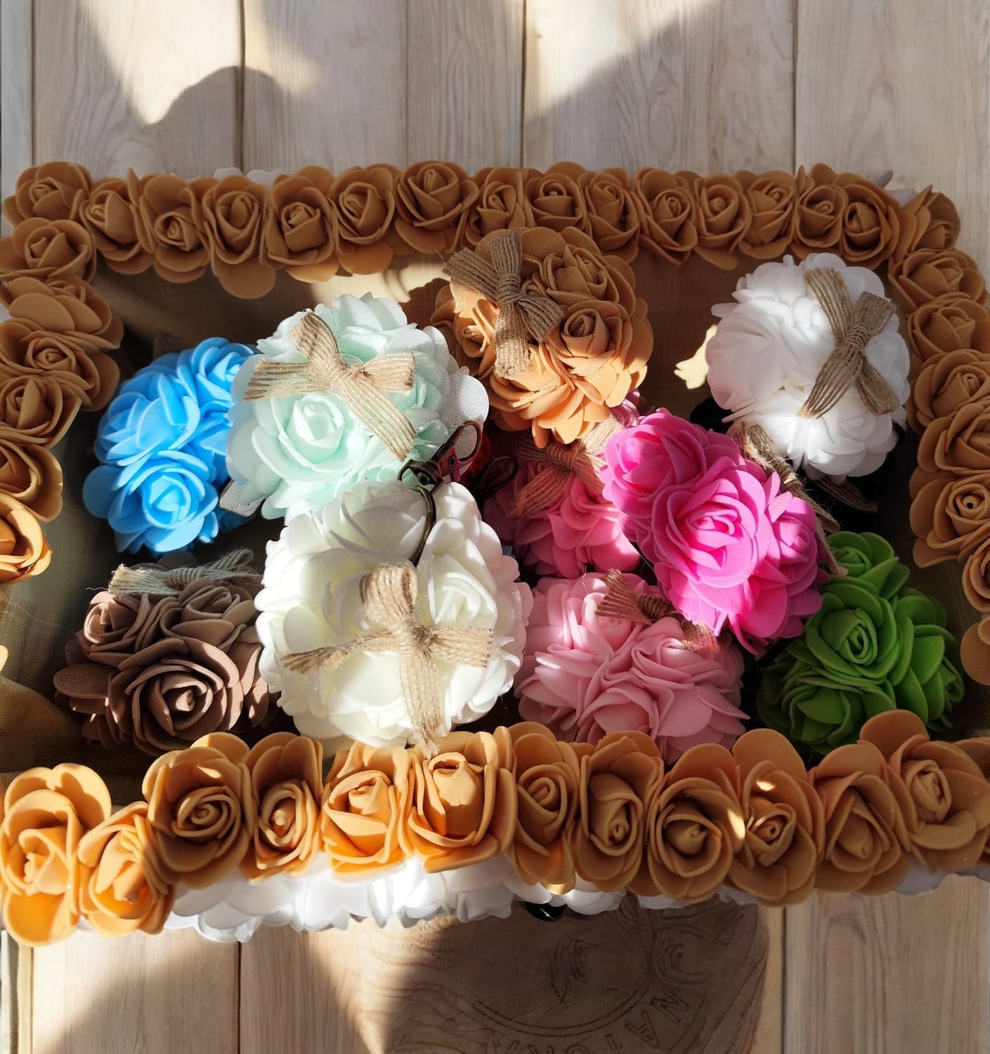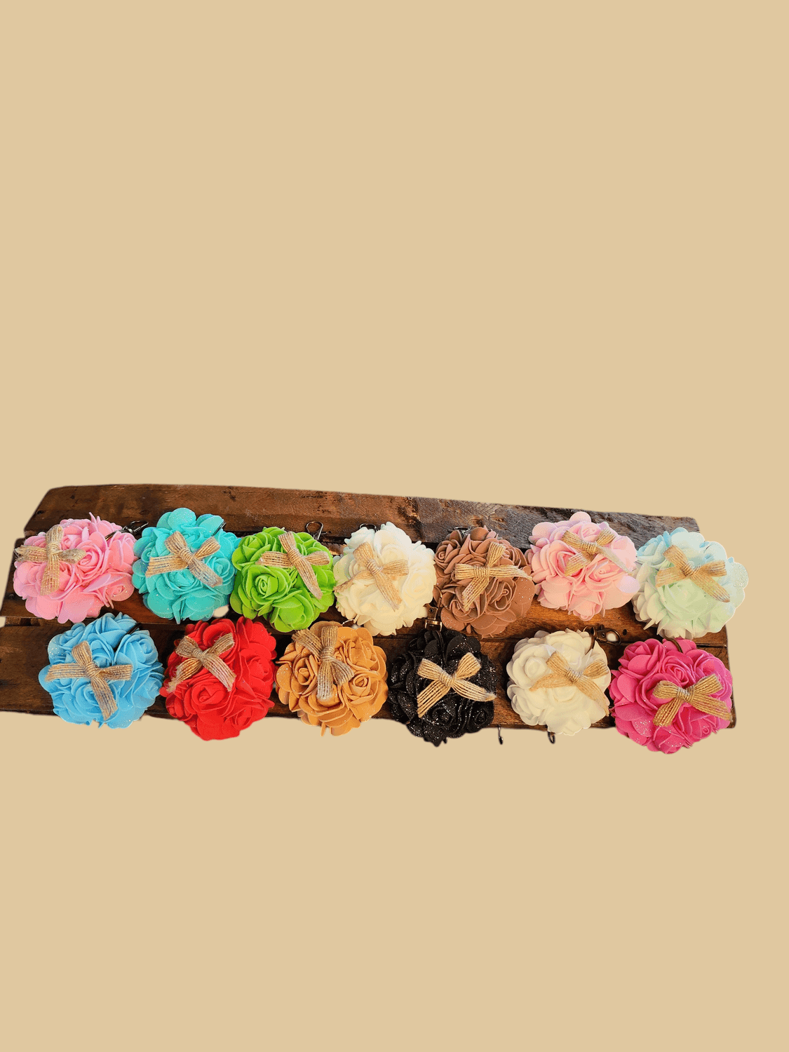 Chaque porte-clé est composé d’un chouchou fleuri travaillé à la main, aux pétales délicatement assemblés, offrant un rendu doux, romantique et féérique.
